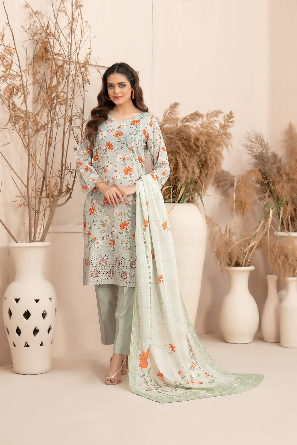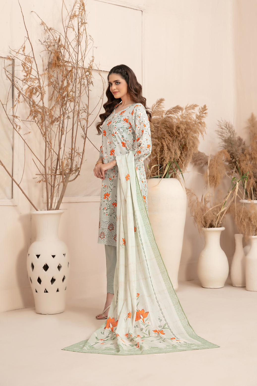 Un-Stitched Embroidered Digital Printed Lawn Shirt Designs with Exclusive Digital Printed Diamond Dupatta & Un-Stitched Plain Cotton Shalwar Fabric.